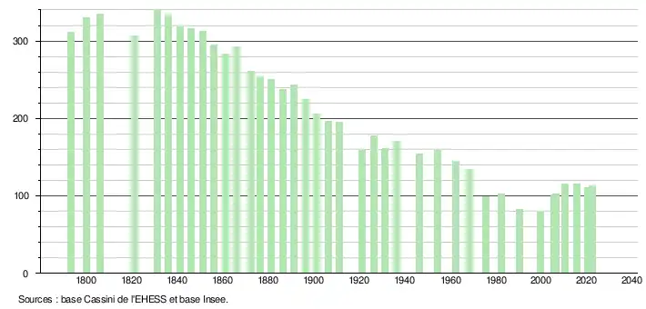 L'évolution du nombre d'habitants est connue à travers les recensements de la population effectués dans la commune depuis 1793. Pour les communes de moins de 10 000 habitants, une enquête de recensement portant sur toute la population est réalisée tous les cinq ans, les populations de référence des années intermédiaires étant quant à elles estimées par interpolation ou extrapolation[17]. Pour la commune, le premier recensement exhaustif entrant dans le cadre du nouveau dispositif a été réalisé en 2005[18].