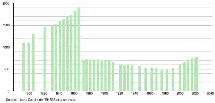L'évolution du nombre d'habitants est connue à travers les recensements de la population effectués dans la commune depuis 1793. Pour les communes de moins de 10 000 habitants, une enquête de recensement portant sur toute la population est réalisée tous les cinq ans, les populations de référence des années intermédiaires étant quant à elles estimées par interpolation ou extrapolation[14]. Pour la commune, le premier recensement exhaustif entrant dans le cadre du nouveau dispositif a été réalisé en 2005[15].