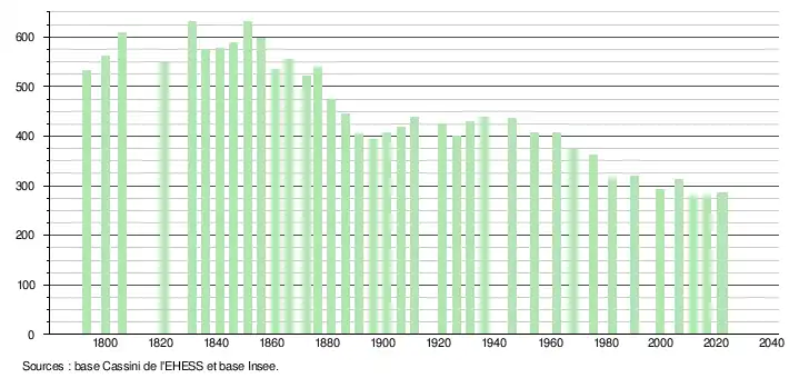 L'évolution du nombre d'habitants est connue à travers les recensements de la population effectués dans la commune depuis 1793. Pour les communes de moins de 10 000 habitants, une enquête de recensement portant sur toute la population est réalisée tous les cinq ans, les populations de référence des années intermédiaires étant quant à elles estimées par interpolation ou extrapolation[14]. Pour la commune, le premier recensement exhaustif entrant dans le cadre du nouveau dispositif a été réalisé en 2006[15].