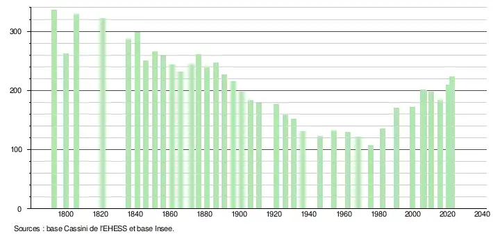 L'évolution du nombre d'habitants est connue à travers les recensements de la population effectués dans la commune depuis 1793. Pour les communes de moins de 10 000 habitants, une enquête de recensement portant sur toute la population est réalisée tous les cinq ans, les populations de référence des années intermédiaires étant quant à elles estimées par interpolation ou extrapolation[13]. Pour la commune, le premier recensement exhaustif entrant dans le cadre du nouveau dispositif a été réalisé en 2005[14].