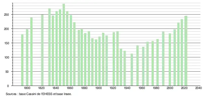 L'évolution du nombre d'habitants est connue à travers les recensements de la population effectués dans la commune depuis 1793. Pour les communes de moins de 10 000 habitants, une enquête de recensement portant sur toute la population est réalisée tous les cinq ans, les populations de référence des années intermédiaires étant quant à elles estimées par interpolation ou extrapolation[27]. Pour la commune, le premier recensement exhaustif entrant dans le cadre du nouveau dispositif a été réalisé en 2006[28].