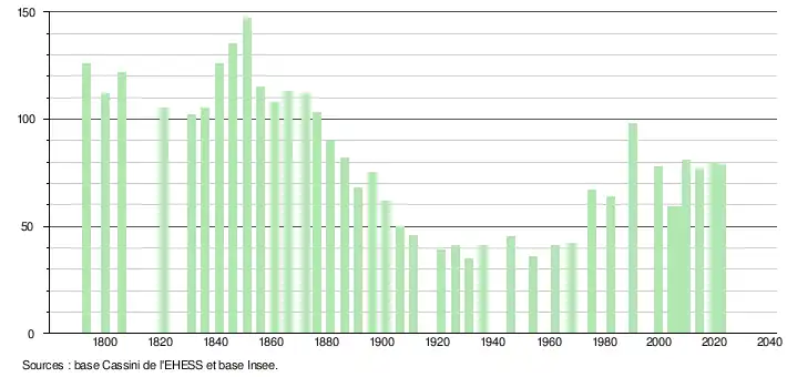 - ↑ Population municipale de référence en vigueur au 1er janvier 2025, millésimée 2022, définie dans les limites territoriales en vigueur au 1er janvier 2024, date de référence statistique : 1er janvier 2022.