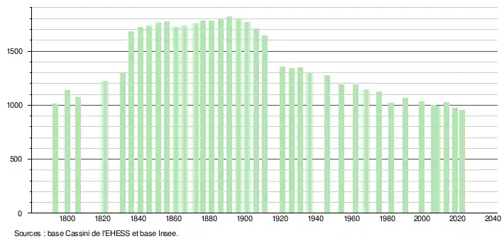 L'évolution du nombre d'habitants est connue à travers les recensements de la population effectués dans la commune depuis 1793. Pour les communes de moins de 10 000 habitants, une enquête de recensement portant sur toute la population est réalisée tous les cinq ans, les populations de référence des années intermédiaires étant quant à elles estimées par interpolation ou extrapolation[24]. Pour la commune, le premier recensement exhaustif entrant dans le cadre du nouveau dispositif a été réalisé en 2008[25].