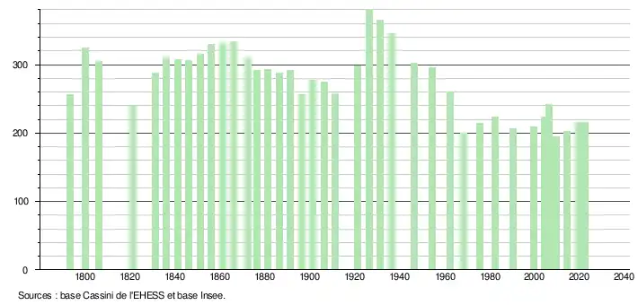 L'évolution du nombre d'habitants est connue à travers les recensements de la population effectués dans la commune depuis 1793. Pour les communes de moins de 10 000 habitants, une enquête de recensement portant sur toute la population est réalisée tous les cinq ans, les populations de référence des années intermédiaires étant quant à elles estimées par interpolation ou extrapolation[29]. Pour la commune, le premier recensement exhaustif entrant dans le cadre du nouveau dispositif a été réalisé en 2004[30].