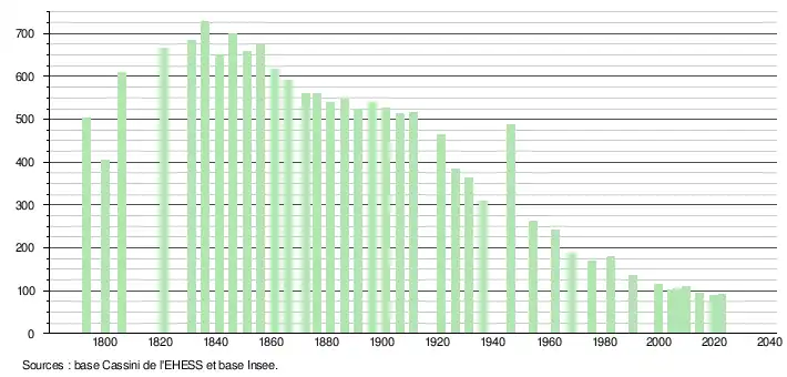 L'évolution du nombre d'habitants est connue à travers les recensements de la population effectués dans la commune depuis 1793. Pour les communes de moins de 10 000 habitants, une enquête de recensement portant sur toute la population est réalisée tous les cinq ans, les populations de référence des années intermédiaires étant quant à elles estimées par interpolation ou extrapolation[21]. Pour la commune, le premier recensement exhaustif entrant dans le cadre du nouveau dispositif a été réalisé en 2004[22].