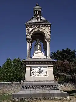 Le mausolée fut ensuite transporté à Saint-Geniez[10]. Il devait être normalement érigé sur la concession que Marie Talabot avait acquise au cimetière, mais le sculpteur souhaitait un emplacement le mettant mieux en valeur et le neveu de Marie Talabot négocia alors avec la mairie un lieu de sépulture pour la bienfaitrice de la commune[10]. Le mausolée fut finalement érigé sur les ruines de l'ancien château-fort[10].