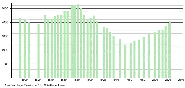 L'évolution du nombre d'habitants est connue à travers les recensements de la population effectués dans la commune depuis 1793. Pour les communes de moins de 10 000 habitants, une enquête de recensement portant sur toute la population est réalisée tous les cinq ans, les populations de référence des années intermédiaires étant quant à elles estimées par interpolation ou extrapolation[36]. Pour la commune, le premier recensement exhaustif entrant dans le cadre du nouveau dispositif a été réalisé en 2006[37].