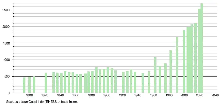 L'évolution du nombre d'habitants est connue à travers les recensements de la population effectués dans la commune depuis 1793. Pour les communes de moins de 10000habitants, une enquête de recensement portant sur toute la population est réalisée tous les cinqans, les populations de référence des années intermédiaires étant quant à elles estimées par interpolation ou extrapolation[19]. Pour la commune, le premier recensement exhaustif entrant dans le cadre du nouveau dispositif a été réalisé en 2004[20].