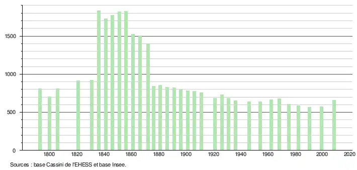 L'évolution du nombre d'habitants est connue à travers les recensements de la population effectués dans la commune depuis 1793. À partir du , les populations légales des communes sont publiées annuellement dans le cadre d'un recensement qui repose désormais sur une collecte d'information annuelle, concernant successivement tous les territoires communaux au cours d'une période de cinq ans. Pour les communes de moins de 10 000 habitants, une enquête de recensement portant sur toute la population est réalisée tous les cinq ans, les populations légales des années intermédiaires étant quant à elles estimées par interpolation ou extrapolation[11]. Pour la commune, le premier recensement exhaustif entrant dans le cadre du nouveau dispositif a été réalisé en 2008[12],[Note 2].