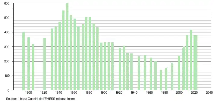 L'évolution du nombre d'habitants est connue à travers les recensements de la population effectués dans la commune depuis 1793. Pour les communes de moins de 10 000 habitants, une enquête de recensement portant sur toute la population est réalisée tous les cinq ans, les populations de référence des années intermédiaires étant quant à elles estimées par interpolation ou extrapolation[17]. Pour la commune, le premier recensement exhaustif entrant dans le cadre du nouveau dispositif a été réalisé en 2005[18].