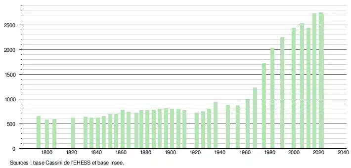L'évolution du nombre d'habitants est connue à travers les recensements de la population effectués dans la commune depuis 1793. Pour les communes de moins de 10 000 habitants, une enquête de recensement portant sur toute la population est réalisée tous les cinq ans, les populations de référence des années intermédiaires étant quant à elles estimées par interpolation ou extrapolation[25]. Pour la commune, le premier recensement exhaustif entrant dans le cadre du nouveau dispositif a été réalisé en 2006[26].