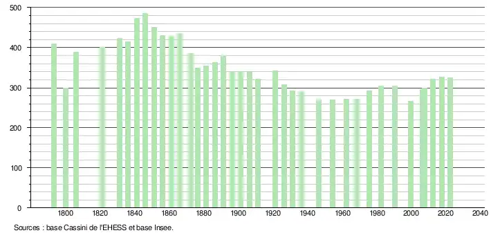 L'évolution du nombre d'habitants est connue à travers les recensements de la population effectués dans la commune depuis 1793. Pour les communes de moins de 10 000 habitants, une enquête de recensement portant sur toute la population est réalisée tous les cinq ans, les populations de référence des années intermédiaires étant quant à elles estimées par interpolation ou extrapolation[26]. Pour la commune, le premier recensement exhaustif entrant dans le cadre du nouveau dispositif a été réalisé en 2007[27].
