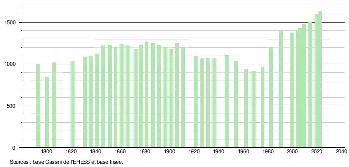 L'évolution du nombre d'habitants est connue à travers les recensements de la population effectués dans la commune depuis 1793. Pour les communes de moins de 10 000 habitants, une enquête de recensement portant sur toute la population est réalisée tous les cinq ans, les populations de référence des années intermédiaires étant quant à elles estimées par interpolation ou extrapolation[16]. Pour la commune, le premier recensement exhaustif entrant dans le cadre du nouveau dispositif a été réalisé en 2004[17].