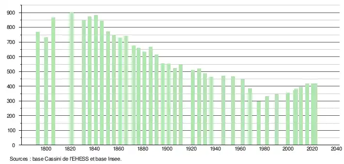 L'évolution du nombre d'habitants est connue à travers les recensements de la population effectués dans la commune depuis 1793. Pour les communes de moins de 10 000 habitants, une enquête de recensement portant sur toute la population est réalisée tous les cinq ans, les populations de référence des années intermédiaires étant quant à elles estimées par interpolation ou extrapolation[40]. Pour la commune, le premier recensement exhaustif entrant dans le cadre du nouveau dispositif a été réalisé en 2005[41].