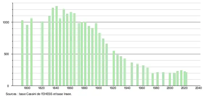 L'évolution du nombre d'habitants est connue à travers les recensements de la population effectués dans la commune depuis 1793. Pour les communes de moins de 10 000 habitants, une enquête de recensement portant sur toute la population est réalisée tous les cinq ans, les populations de référence des années intermédiaires étant quant à elles estimées par interpolation ou extrapolation[13]. Pour la commune, le premier recensement exhaustif entrant dans le cadre du nouveau dispositif a été réalisé en 2005[14].