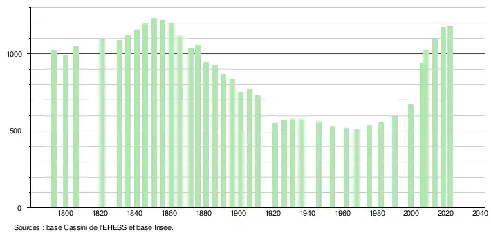 L'évolution du nombre d'habitants est connue à travers les recensements de la population effectués dans la commune depuis 1793. Pour les communes de moins de 10 000 habitants, une enquête de recensement portant sur toute la population est réalisée tous les cinq ans, les populations de référence des années intermédiaires étant quant à elles estimées par interpolation ou extrapolation[17]. Pour la commune, le premier recensement exhaustif entrant dans le cadre du nouveau dispositif a été réalisé en 2008[18].