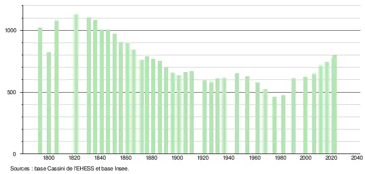 L'évolution du nombre d'habitants est connue à travers les recensements de la population effectués dans la commune depuis 1793. Pour les communes de moins de 10 000 habitants, une enquête de recensement portant sur toute la population est réalisée tous les cinq ans, les populations de référence des années intermédiaires étant quant à elles estimées par interpolation ou extrapolation[29]. Pour la commune, le premier recensement exhaustif entrant dans le cadre du nouveau dispositif a été réalisé en 2006[30].