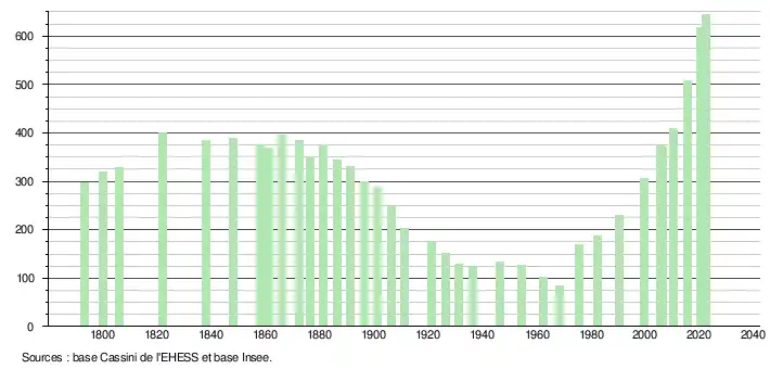 L'évolution du nombre d'habitants est connue à travers les recensements de la population effectués dans la commune depuis 1793. Pour les communes de moins de 10 000 habitants, une enquête de recensement portant sur toute la population est réalisée tous les cinq ans, les populations de référence des années intermédiaires étant quant à elles estimées par interpolation ou extrapolation[12]. Pour la commune, le premier recensement exhaustif entrant dans le cadre du nouveau dispositif a été réalisé en 2005[13].
