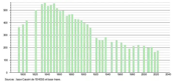 L'évolution du nombre d'habitants est connue à travers les recensements de la population effectués dans la commune depuis 1793. Pour les communes de moins de 10 000 habitants, une enquête de recensement portant sur toute la population est réalisée tous les cinq ans, les populations de référence des années intermédiaires étant quant à elles estimées par interpolation ou extrapolation[25]. Pour la commune, le premier recensement exhaustif entrant dans le cadre du nouveau dispositif a été réalisé en 2007[26].