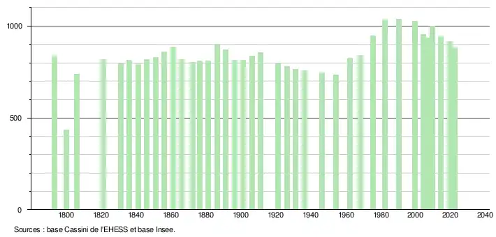 L'évolution du nombre d'habitants est connue à travers les recensements de la population effectués dans la commune depuis 1793. Pour les communes de moins de 10 000 habitants, une enquête de recensement portant sur toute la population est réalisée tous les cinq ans, les populations de référence des années intermédiaires étant quant à elles estimées par interpolation ou extrapolation[23]. Pour la commune, le premier recensement exhaustif entrant dans le cadre du nouveau dispositif a été réalisé en 2004[24].