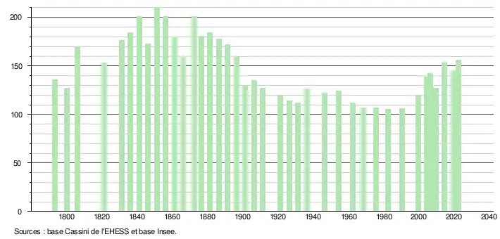 | L'évolution du nombre d'habitants est connue à travers les recensements de la population effectués dans la commune depuis 1793. Pour les communes de moins de 10 000 habitants, une enquête de recensement portant sur toute la population est réalisée tous les cinq ans, les populations de référence des années intermédiaires étant quant à elles estimées par interpolation ou extrapolation[26]. Pour la commune, le premier recensement exhaustif entrant dans le cadre du nouveau dispositif a été réalisé en 2004[27]. En 2022, la commune comptait 156 habitants[Note 4], en évolution de −7,14 % par rapport à 2016 (Tarn : +2,52 %, France hors Mayotte : +2,11 %). |