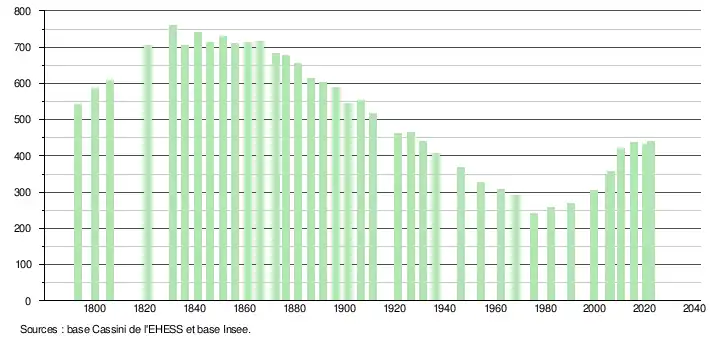 L'évolution du nombre d'habitants est connue à travers les recensements de la population effectués dans la commune depuis 1793. Pour les communes de moins de 10 000 habitants, une enquête de recensement portant sur toute la population est réalisée tous les cinq ans, les populations de référence des années intermédiaires étant quant à elles estimées par interpolation ou extrapolation[13]. Pour la commune, le premier recensement exhaustif entrant dans le cadre du nouveau dispositif a été réalisé en 2005[14].
