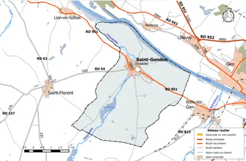 La commune de Saint-Gondon se trouve dans le quadrant sud-est du département du Loiret, dans la région agricole de la Sologne[2] et l'aire urbaine de Gien[3]. À vol d'oiseau, elle se situe à 52,6 km d'Orléans[4], préfecture du département, à 36,7 km de Montargis[5], sous-préfecture, et à 6,7 km de Gien, ancien chef-lieu du canton dont dépendait la commune avant . La commune fait partie du bassin de vie de Gien[3].