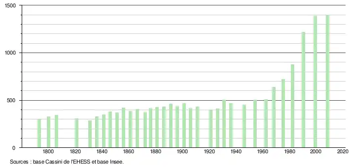 - ↑ Dans le tableau des recensements et le graphique, par convention dans Wikipédia, le principe a été retenu, pour les populations légales postérieures à 1999 de n’afficher dans le tableau des recensements et le graphique que les populations correspondant à l'année 2006, première population légale publiée calculée conformément aux concepts définis dans le décret no 2003-485 du 5 juin 2003, et les années correspondant à une enquête exhaustive de recensement pour les communes de moins de 10 000 habitants, ainsi que la dernière population légale publiée par l’Insee.