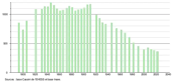 L'évolution du nombre d'habitants est connue à travers les recensements de la population effectués dans la commune depuis 1793. Pour les communes de moins de 10 000 habitants, une enquête de recensement portant sur toute la population est réalisée tous les cinq ans, les populations de référence des années intermédiaires étant quant à elles estimées par interpolation ou extrapolation[29]. Pour la commune, le premier recensement exhaustif entrant dans le cadre du nouveau dispositif a été réalisé en 2006[30].
