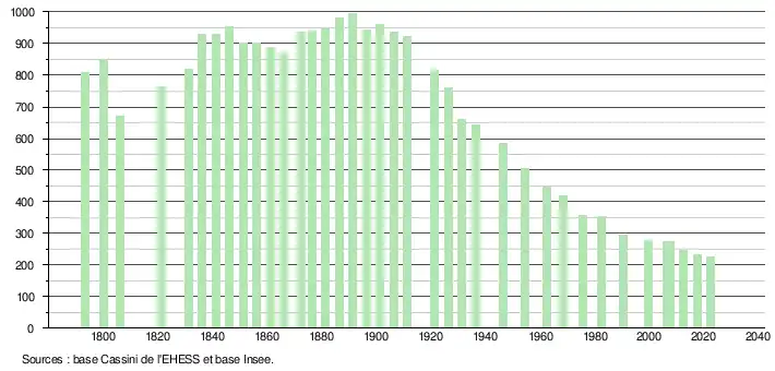 L'évolution du nombre d'habitants est connue à travers les recensements de la population effectués dans la commune depuis 1793. Pour les communes de moins de 10 000 habitants, une enquête de recensement portant sur toute la population est réalisée tous les cinq ans, les populations de référence des années intermédiaires étant quant à elles estimées par interpolation ou extrapolation[23]. Pour la commune, le premier recensement exhaustif entrant dans le cadre du nouveau dispositif a été réalisé en 2007[24].