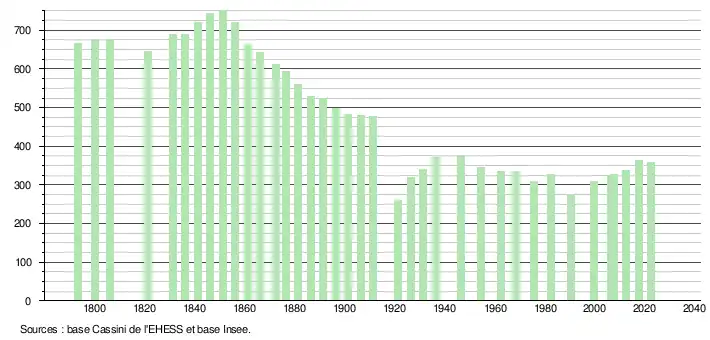 L'évolution du nombre d'habitants est connue à travers les recensements de la population effectués dans la commune depuis 1793. Pour les communes de moins de 10 000 habitants, une enquête de recensement portant sur toute la population est réalisée tous les cinq ans, les populations de référence des années intermédiaires étant quant à elles estimées par interpolation ou extrapolation[25]. Pour la commune, le premier recensement exhaustif entrant dans le cadre du nouveau dispositif a été réalisé en 2007[26].