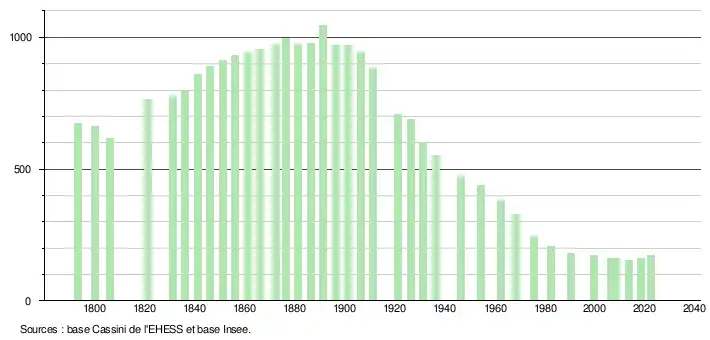 L'évolution du nombre d'habitants est connue à travers les recensements de la population effectués dans la commune depuis 1793. Pour les communes de moins de 10 000 habitants, une enquête de recensement portant sur toute la population est réalisée tous les cinq ans, les populations de référence des années intermédiaires étant quant à elles estimées par interpolation ou extrapolation[21]. Pour la commune, le premier recensement exhaustif entrant dans le cadre du nouveau dispositif a été réalisé en 2008[22].
