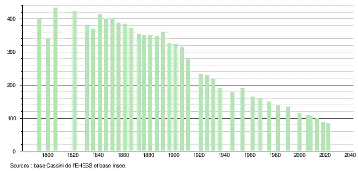 L'évolution du nombre d'habitants est connue à travers les recensements de la population effectués dans la commune depuis 1793. Pour les communes de moins de 10 000 habitants, une enquête de recensement portant sur toute la population est réalisée tous les cinq ans, les populations de référence des années intermédiaires étant quant à elles estimées par interpolation ou extrapolation[23]. Pour la commune, le premier recensement exhaustif entrant dans le cadre du nouveau dispositif a été réalisé en 2008[24].