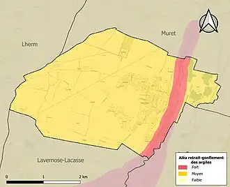 Le retrait-gonflement des sols argileux est susceptible d'engendrer des dommages importants aux bâtiments en cas d’alternance de périodes de sécheresse et de pluie. La totalité de la commune est en aléa moyen ou fort (88,8 % au niveau départemental et 48,5 % au niveau national). Sur les 428 bâtiments dénombrés sur la commune en 2019, 428 sont en aléa moyen ou fort, soit 100 %, à comparer aux 98 % au niveau départemental et 54 % au niveau national. Une cartographie de l'exposition du territoire national au retrait gonflement des sols argileux est disponible sur le site du BRGM[24],[Carte 3].