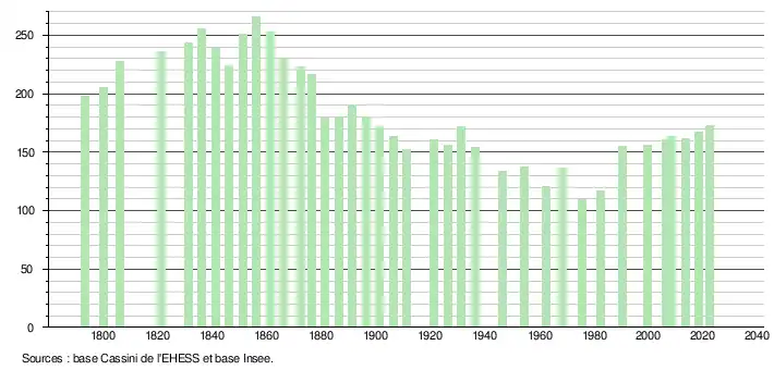 L'évolution du nombre d'habitants est connue à travers les recensements de la population effectués dans la commune depuis 1793. Pour les communes de moins de 10 000 habitants, une enquête de recensement portant sur toute la population est réalisée tous les cinq ans, les populations de référence des années intermédiaires étant quant à elles estimées par interpolation ou extrapolation[16]. Pour la commune, le premier recensement exhaustif entrant dans le cadre du nouveau dispositif a été réalisé en 2008[17].
