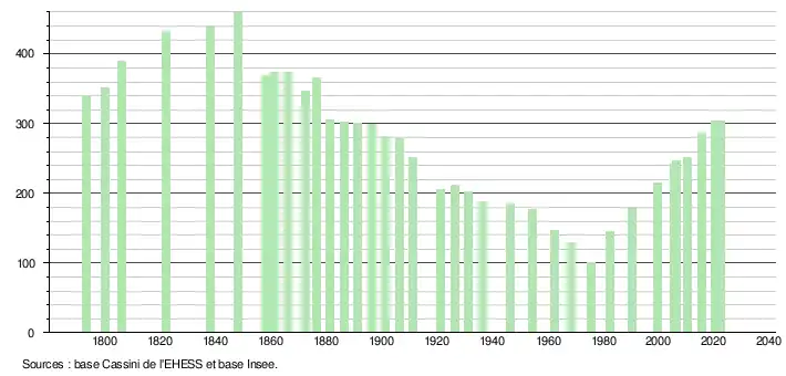 L'évolution du nombre d'habitants est connue à travers les recensements de la population effectués dans la commune depuis 1793. Pour les communes de moins de 10 000 habitants, une enquête de recensement portant sur toute la population est réalisée tous les cinq ans, les populations de référence des années intermédiaires étant quant à elles estimées par interpolation ou extrapolation[23]. Pour la commune, le premier recensement exhaustif entrant dans le cadre du nouveau dispositif a été réalisé en 2005[24].