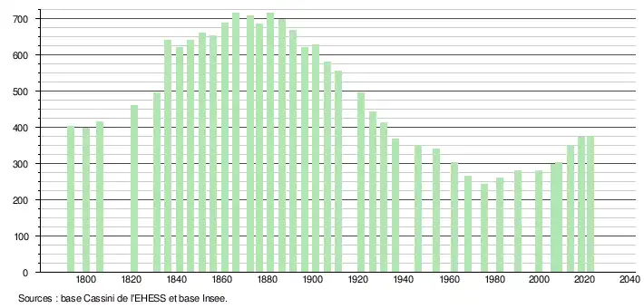 L'évolution du nombre d'habitants est connue à travers les recensements de la population effectués dans la commune depuis 1793. Pour les communes de moins de 10 000 habitants, une enquête de recensement portant sur toute la population est réalisée tous les cinq ans, les populations de référence des années intermédiaires étant quant à elles estimées par interpolation ou extrapolation[15]. Pour la commune, le premier recensement exhaustif entrant dans le cadre du nouveau dispositif a été réalisé en 2008[16].