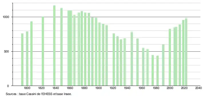 L'évolution du nombre d'habitants est connue à travers les recensements de la population effectués dans la commune depuis 1793. Pour les communes de moins de 10 000 habitants, une enquête de recensement portant sur toute la population est réalisée tous les cinq ans, les populations de référence des années intermédiaires étant quant à elles estimées par interpolation ou extrapolation[10]. Pour la commune, le premier recensement exhaustif entrant dans le cadre du nouveau dispositif a été réalisé en 2008[11].