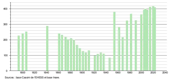 L'évolution du nombre d'habitants est connue à travers les recensements de la population effectués dans la commune depuis 1793. Pour les communes de moins de 10 000 habitants, une enquête de recensement portant sur toute la population est réalisée tous les cinq ans, les populations de référence des années intermédiaires étant quant à elles estimées par interpolation ou extrapolation[20]. Pour la commune, le premier recensement exhaustif entrant dans le cadre du nouveau dispositif a été réalisé en 2004[21].