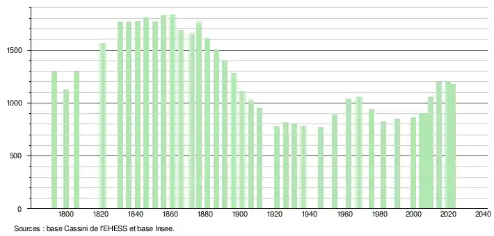 L'évolution du nombre d'habitants est connue à travers les recensements de la population effectués dans la commune depuis 1793. Pour les communes de moins de 10 000 habitants, une enquête de recensement portant sur toute la population est réalisée tous les cinq ans, les populations de référence des années intermédiaires étant quant à elles estimées par interpolation ou extrapolation[13]. Pour la commune, le premier recensement exhaustif entrant dans le cadre du nouveau dispositif a été réalisé en 2004[14].