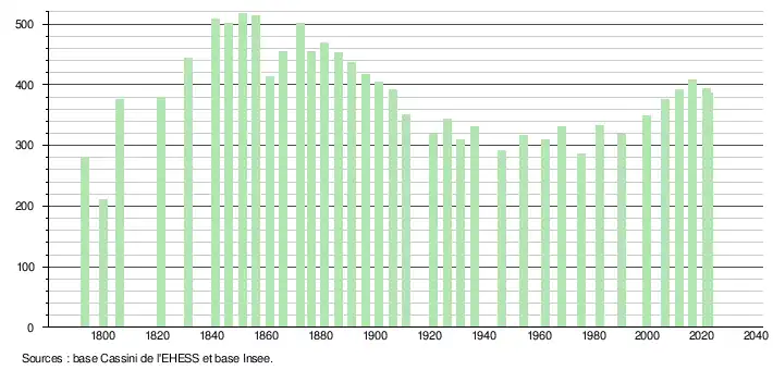 | L'évolution du nombre d'habitants est connue à travers les recensements de la population effectués dans la commune depuis 1793. Pour les communes de moins de 10 000 habitants, une enquête de recensement portant sur toute la population est réalisée tous les cinq ans, les populations de référence des années intermédiaires étant quant à elles estimées par interpolation ou extrapolation[24]. Pour la commune, le premier recensement exhaustif entrant dans le cadre du nouveau dispositif a été réalisé en 2006[25]. En 2022, la commune comptait 386 habitants[Note 5], en évolution de −5,39 % par rapport à 2016 (Gers : +1,04 %, France hors Mayotte : +2,11 %). |