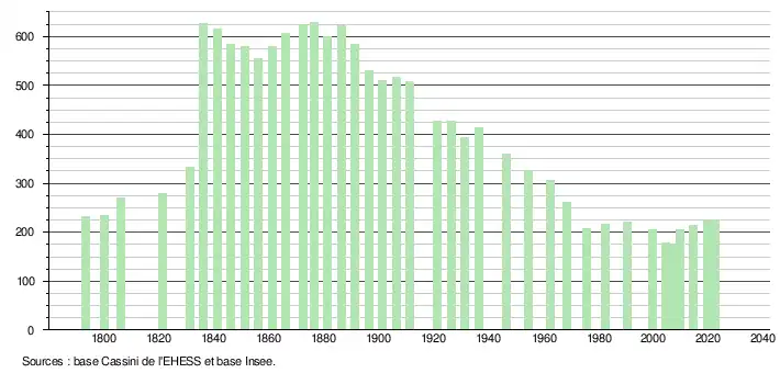 L'évolution du nombre d'habitants est connue à travers les recensements de la population effectués dans la commune depuis 1793. Pour les communes de moins de 10 000 habitants, une enquête de recensement portant sur toute la population est réalisée tous les cinq ans, les populations de référence des années intermédiaires étant quant à elles estimées par interpolation ou extrapolation[33]. Pour la commune, le premier recensement exhaustif entrant dans le cadre du nouveau dispositif a été réalisé en 2004[34].