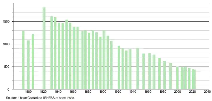 L'évolution du nombre d'habitants est connue à travers les recensements de la population effectués dans la commune depuis 1793. Pour les communes de moins de 10 000 habitants, une enquête de recensement portant sur toute la population est réalisée tous les cinq ans, les populations de référence des années intermédiaires étant quant à elles estimées par interpolation ou extrapolation[24]. Pour la commune, le premier recensement exhaustif entrant dans le cadre du nouveau dispositif a été réalisé en 2005[25].