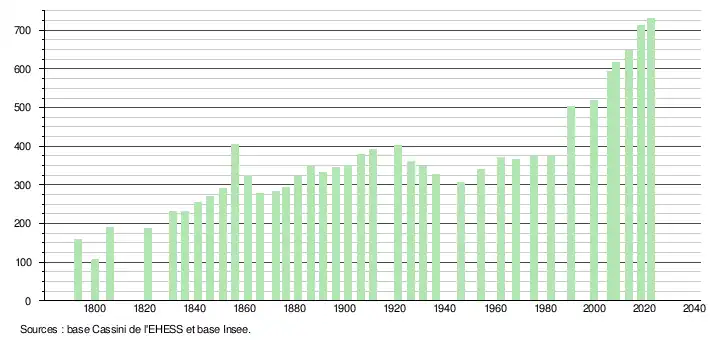 L'évolution du nombre d'habitants est connue à travers les recensements de la population effectués dans la commune depuis 1793. Pour les communes de moins de 10 000 habitants, une enquête de recensement portant sur toute la population est réalisée tous les cinq ans, les populations de référence des années intermédiaires étant quant à elles estimées par interpolation ou extrapolation[20]. Pour la commune, le premier recensement exhaustif entrant dans le cadre du nouveau dispositif a été réalisé en 2008[21].