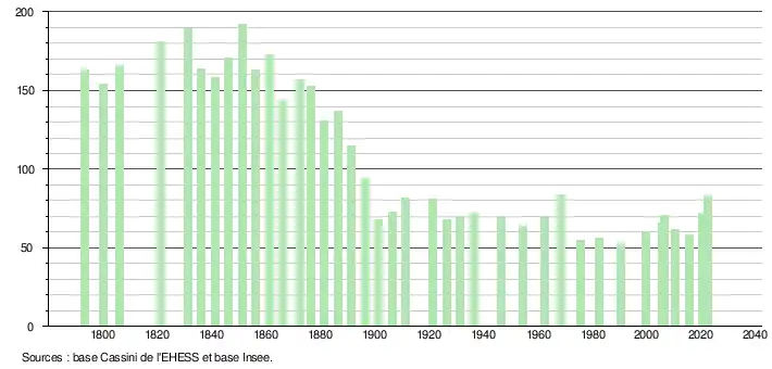 | L'évolution du nombre d'habitants est connue à travers les recensements de la population effectués dans la commune depuis 1793. Pour les communes de moins de 10 000 habitants, une enquête de recensement portant sur toute la population est réalisée tous les cinq ans, les populations de référence des années intermédiaires étant quant à elles estimées par interpolation ou extrapolation[39]. Pour la commune, le premier recensement exhaustif entrant dans le cadre du nouveau dispositif a été réalisé en 2005[40]. En 2022, la commune comptait 83 habitants[Note 5], en évolution de +48,21 % par rapport à 2016 (Ariège : +1,48 %, France hors Mayotte : +2,11 %). |
