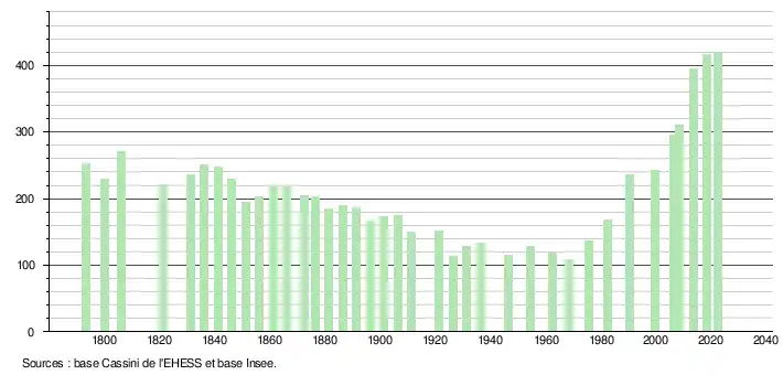 L'évolution du nombre d'habitants est connue à travers les recensements de la population effectués dans la commune depuis 1793. Pour les communes de moins de 10 000 habitants, une enquête de recensement portant sur toute la population est réalisée tous les cinq ans, les populations de référence des années intermédiaires étant quant à elles estimées par interpolation ou extrapolation[24]. Pour la commune, le premier recensement exhaustif entrant dans le cadre du nouveau dispositif a été réalisé en 2008[25].