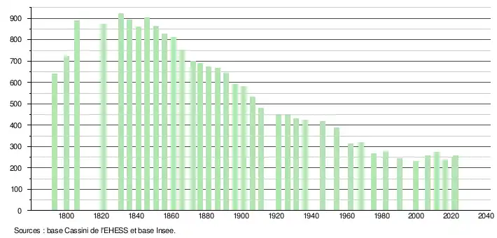 L'évolution du nombre d'habitants est connue à travers les recensements de la population effectués dans la commune depuis 1793. Pour les communes de moins de 10 000 habitants, une enquête de recensement portant sur toute la population est réalisée tous les cinq ans, les populations de référence des années intermédiaires étant quant à elles estimées par interpolation ou extrapolation[16]. Pour la commune, le premier recensement exhaustif entrant dans le cadre du nouveau dispositif a été réalisé en 2006[17].