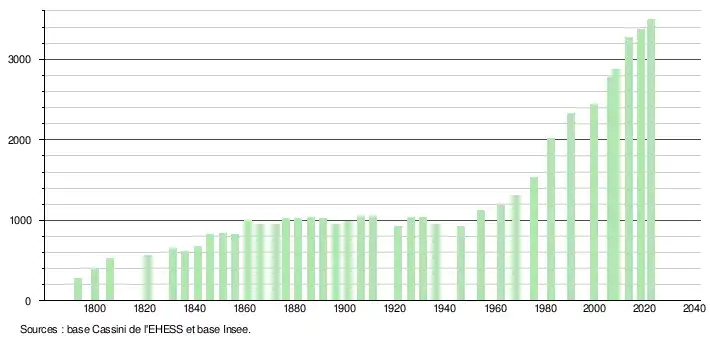 L'évolution du nombre d'habitants est connue à travers les recensements de la population effectués dans la commune depuis 1793. Pour les communes de moins de 10 000 habitants, une enquête de recensement portant sur toute la population est réalisée tous les cinq ans, les populations de référence des années intermédiaires étant quant à elles estimées par interpolation ou extrapolation[22]. Pour la commune, le premier recensement exhaustif entrant dans le cadre du nouveau dispositif a été réalisé en 2008[23].