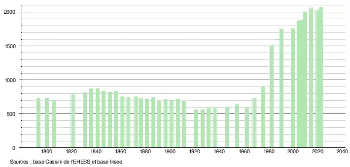 L'évolution du nombre d'habitants est connue à travers les recensements de la population effectués dans la commune depuis 1793. Pour les communes de moins de 10 000 habitants, une enquête de recensement portant sur toute la population est réalisée tous les cinq ans, les populations de référence des années intermédiaires étant quant à elles estimées par interpolation ou extrapolation[24]. Pour la commune, le premier recensement exhaustif entrant dans le cadre du nouveau dispositif a été réalisé en 2004[25].