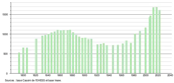 L'évolution du nombre d'habitants est connue à travers les recensements de la population effectués dans la commune depuis 1793. Pour les communes de moins de 10 000 habitants, une enquête de recensement portant sur toute la population est réalisée tous les cinq ans, les populations de référence des années intermédiaires étant quant à elles estimées par interpolation ou extrapolation[29]. Pour la commune, le premier recensement exhaustif entrant dans le cadre du nouveau dispositif a été réalisé en 2007[30].